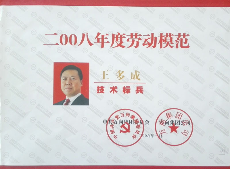 榮獲2008年度萬向集團勞動模范證書